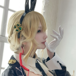 さらに、ブロンドヘアに黒いウサ耳カチューシャを合わせた髪型、胸元に揺れる眼鏡の小物使いなど、細部に至るまで完成度の高さが際立ちます。