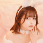 そして視線を一気にさらうのが、頭に装着された白くてふわふわなウサ耳カチューシャ。柔らかい素材感が、全体の可愛らしさを底上げし、王道のバニーガールらしさをきれいに完成させています。加えて、首元の小さな金色チョーカーが甘さに艶を足し、茶色のストレートミディアムヘアや、くりくりとした瞳、柔らかな表情まで含めて、キュートとセクシーが同じ温度で同居する一枚に仕上がっていました。