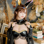 黒×ゴールドを基調にしたエナメル素材のビスチェとボトムス、ゴールド装飾やクロスのアクセサリーが神秘感を強め、片脚だけ布を巻いてもう片脚は素肌を見せるアシンメトリーな構成が艶っぽさを際立たせていました。犬耳アクセや額の青い宝石、チョーカーまで揃えた姿は“化身”のような完成度で、古代の書庫を思わせる背景演出も相まって世界観がしっかり成立し、コメント欄でも「女神」「神」「信仰を捧げる」など熱量の高い称賛が集まった投稿でした。