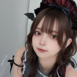 さらに頭には、ワインレッドのフリルに悪魔の羽モチーフがついたカチューシャを装着。そこに「上から撮った構図」と、カメラを見上げる上目遣いが重なることで、“小悪魔っぽさ”が一気に説得力を持ち、黒の網タイツも含めて全体がきれいにまとまっていたのが印象的です。