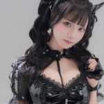 今回モカさんが着用しているのは、光沢感たっぷりの黒いエナメル衣装。胸元はレースがあしらわれたビスチェ風のデザインで、中央に輝くシルバーのクロスがアクセントになっています。 ボトムスはタイトなショート丈で、太ももには複雑に交差するガーターベルトと網タイツをチョイス。エナメルのハードな質感と、レースや網タイツの繊細なセクシーさが絶妙にミックスされています。 ヘアスタイルは、ゆるく巻かれた黒髪のツインテールに、リボンのついたカチューシャをプラス。どこかメイド服のような可愛らしさを残しつつも、全身を黒で統一することで、小悪魔的な魅力を最大限に引き出しています。